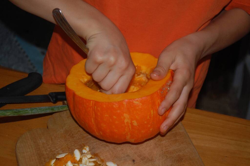 2. נוציא את הגרעינים שבדלעת וננקה את הדפנות הפנימיות של הדלעת.