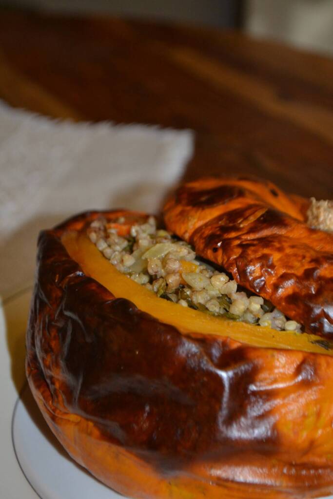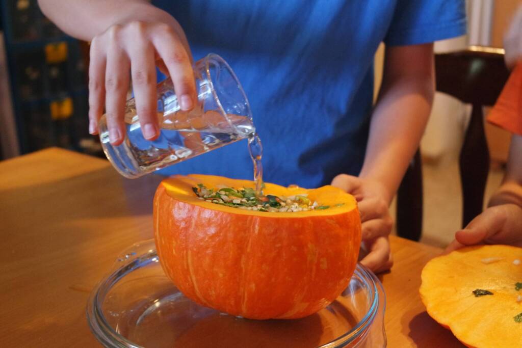 6. נמלא את הדלעת בתערובת שהכנו, נוסיף כחצי כוס מים ונכסה עם הכיפה של הדלעת שחתכנו קודם.