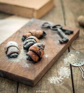 - נחתוך את העיגול ל-12 משולשים (כמו פיצה) ונגלגל כל משולש לצורת רוגלך; מהקצה הרחב אל הקודקוד.